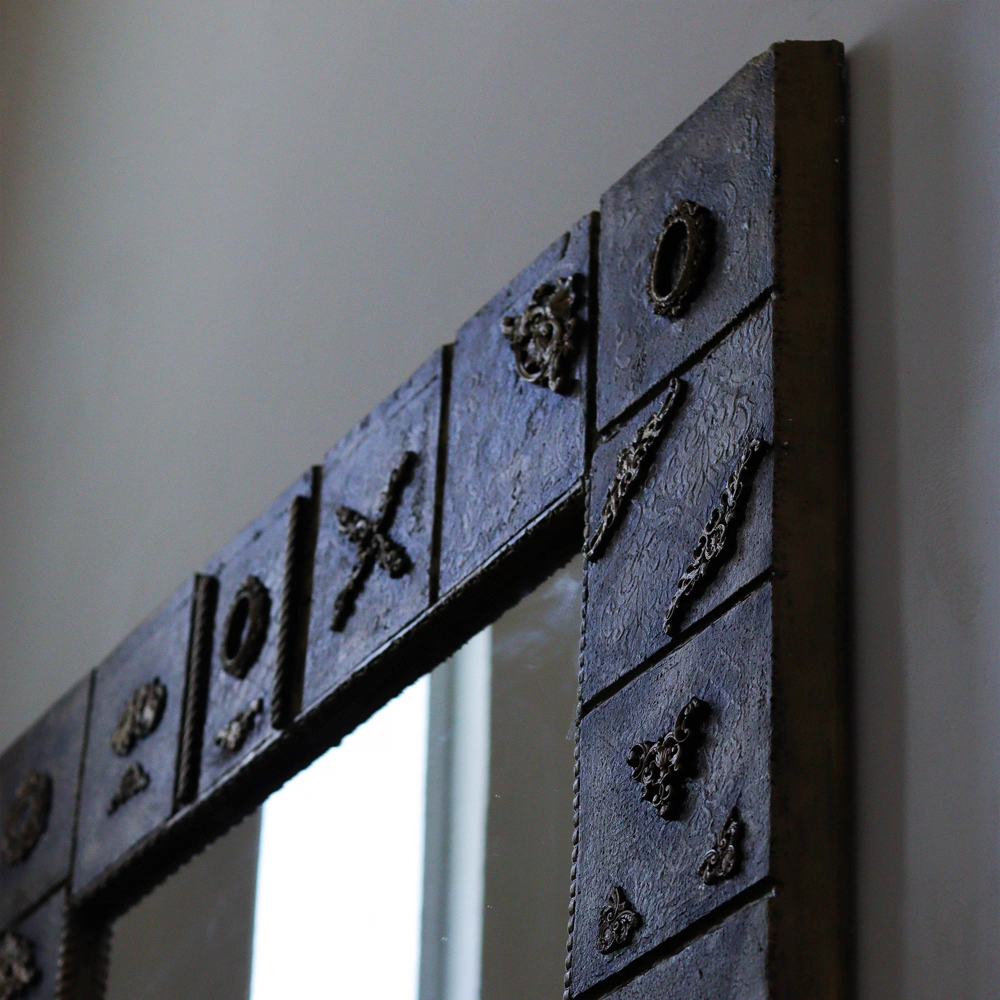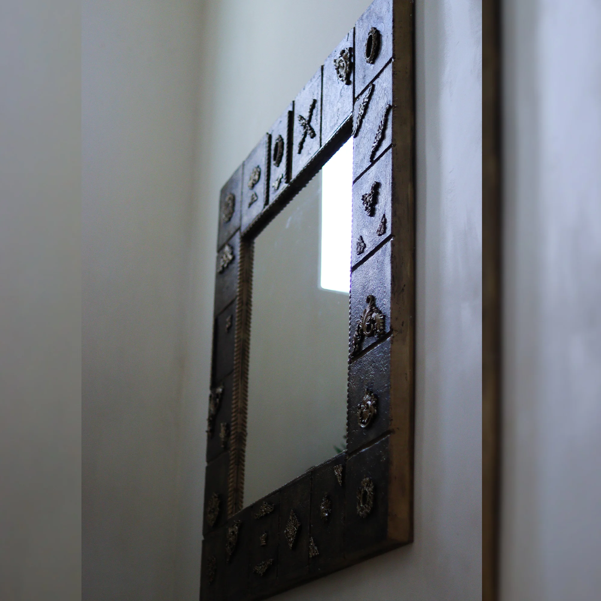 Este espejo decorativo de madera refleja un estilo único gracias a su marquetería artesanal y su fondo con relieve. Cada detalle ha sido pensado para añadir personalidad y una atmósfera acogedora a cualquier espacio.